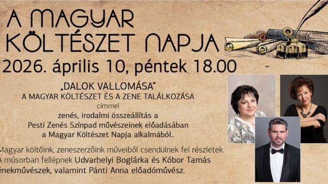 Tisztelettel meghívjuk Önt és kedves családját 2026. április 10-én, pénteken 18 órára a Magyar Költészet Napja alkalmából megrendezésre kerülő zenés, irodalmi estünkre a dunavarsányi Petőfi Művelődési Ház és Könyvtárba. „DALOK VALLOMÁSA” – A MAGYAR KÖLTÉSZET […]