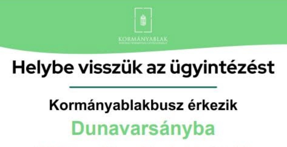 Mobilizált Kormányablak Ügyfélszolgálat érkezik 2025. május 21. napján 9:30-14:30 között a Polgármesteri Hivatal (Dunavarsány, Kossuth u. 18.) udvarára, ahol lehetőségük lesz a mobil kormányablak busz által nyújtott szolgáltatások igénybevételére az alábbi ügytípusokban: