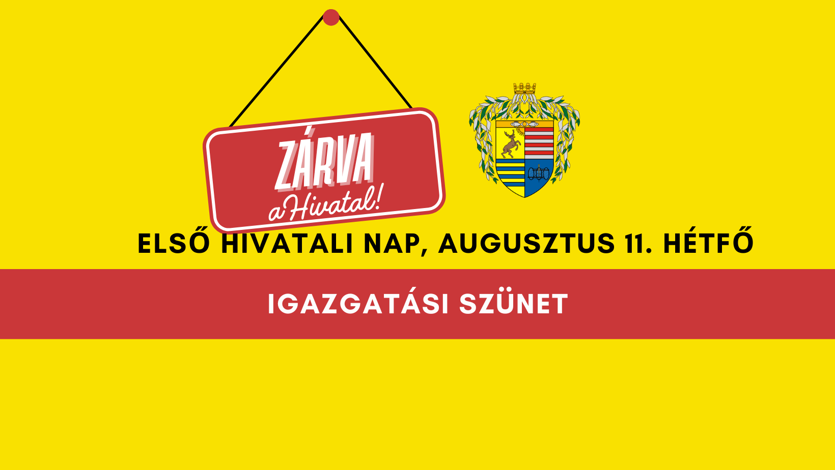 Az igazgatási szünet időtartama alatt a Közös Önkormányzati Hivatal zárva tart, kizárólag a halaszthatatlan anyakönyvi ügyek (halálesetek) anyakönyvezését végzi ügyeleti rendszerben. Az ügyintézésre előzetes időpont egyeztetés után kerül sor.