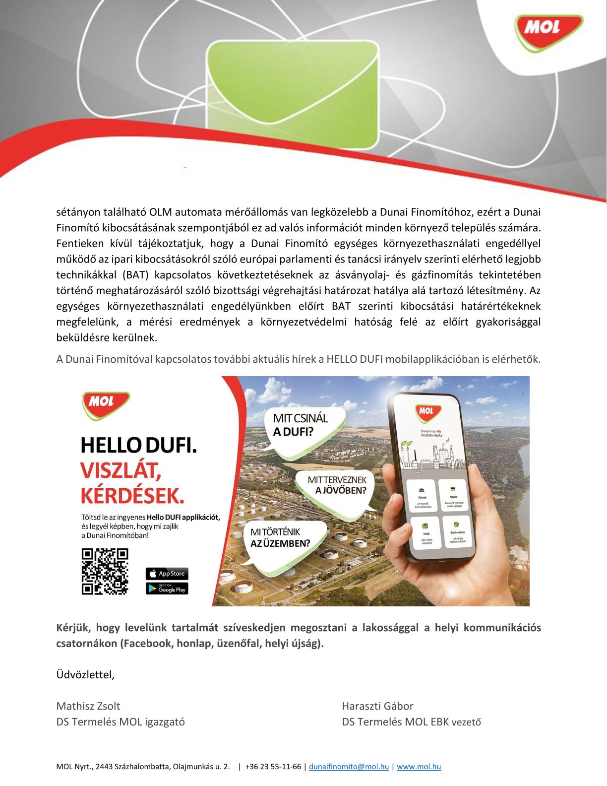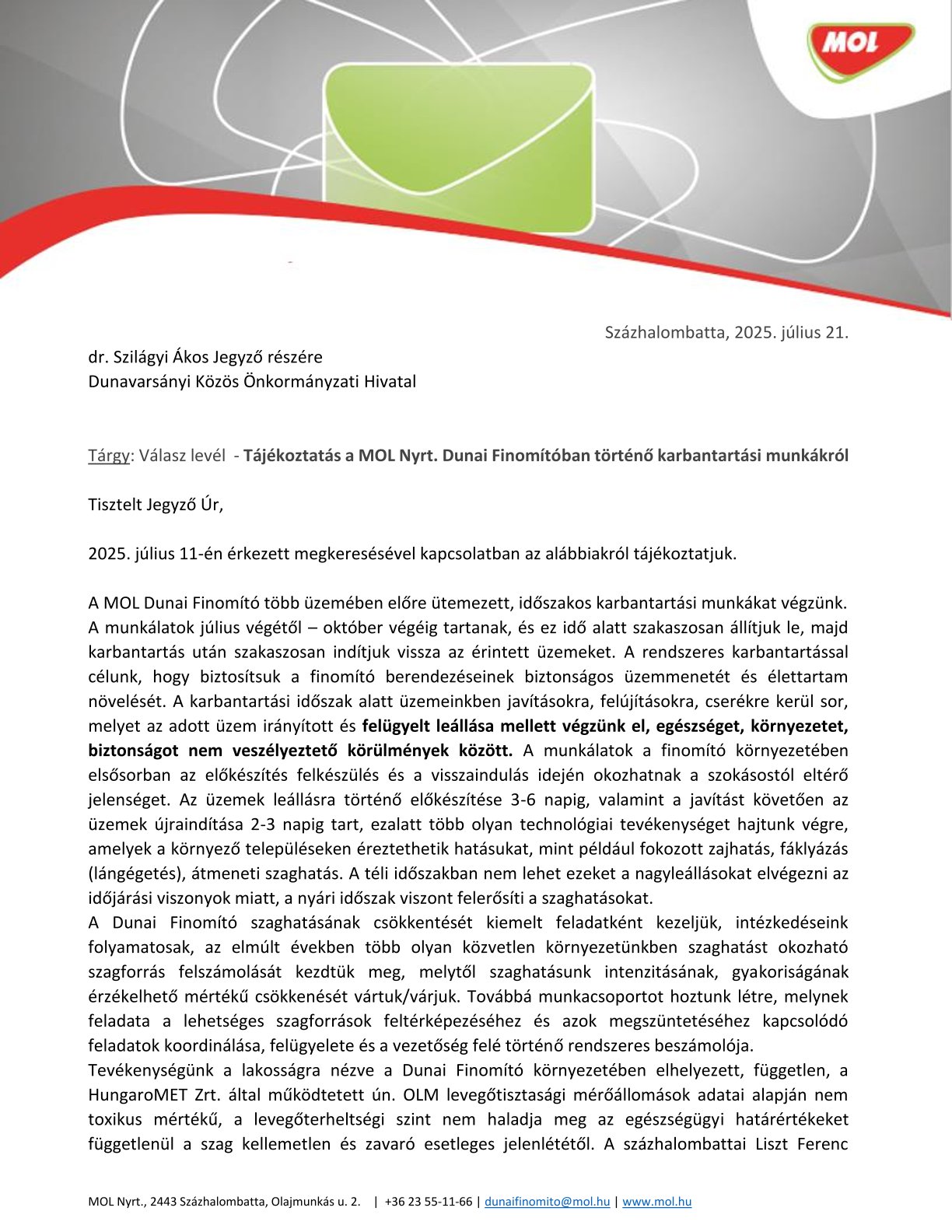 A MOL Nyrt., a Dunai Finomítóban történő karbantartási munkákról tájékoztatta Önkormányzatunkat nyár elején. Miután a karbantartás idején Dunavarsány területén szaghatás volt érzékelhető, Önkormányzatunk tájékoztatást kért a MOL Nyrt. Dunai Finomítóban történő karbantartási munkákról minőségéről, amelyre alábbi válaszlevelet kaptuk.