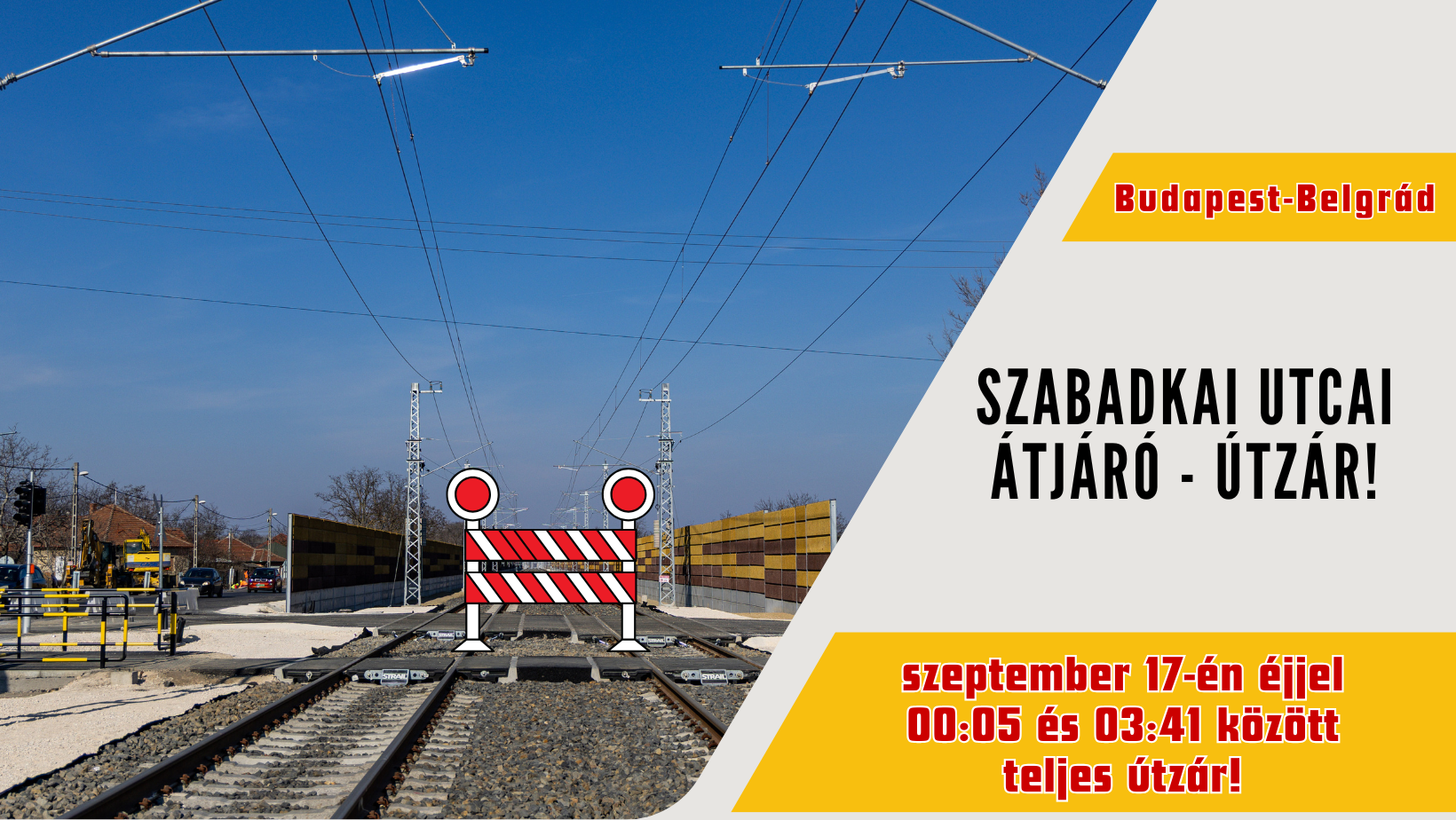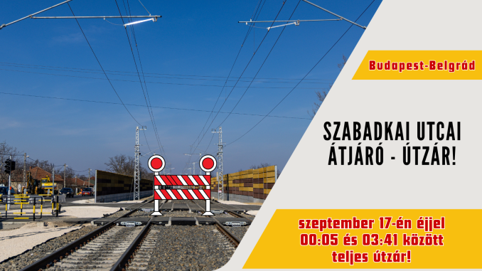 Ma hajnalban ismételten lokális vágányszabályozási munkákat végeznek a Budapest-Belgrád vasútvonal kivitelezői, így a Szabadkai utcai átjáró lezárásra kerül szeptember 17-én szerdán, 00:05-03:41-ig. A Halász Lajosné utcai átjárón a forgalom zavartalan lesz.