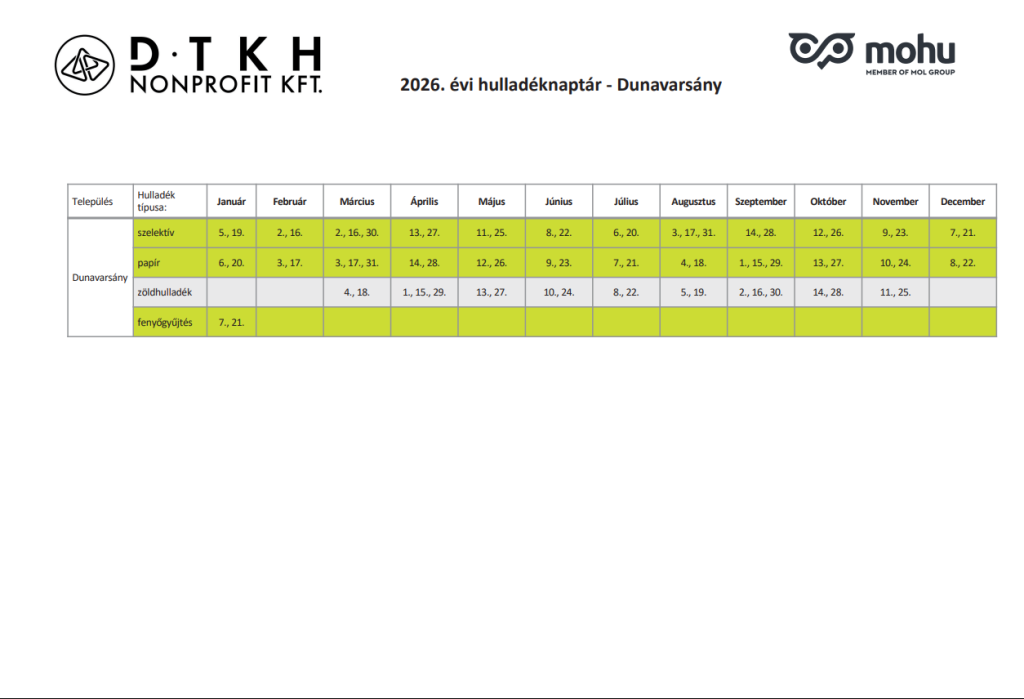 Dunavarsány 2026. évre vonatkozó hulladékgyűjtési naptára