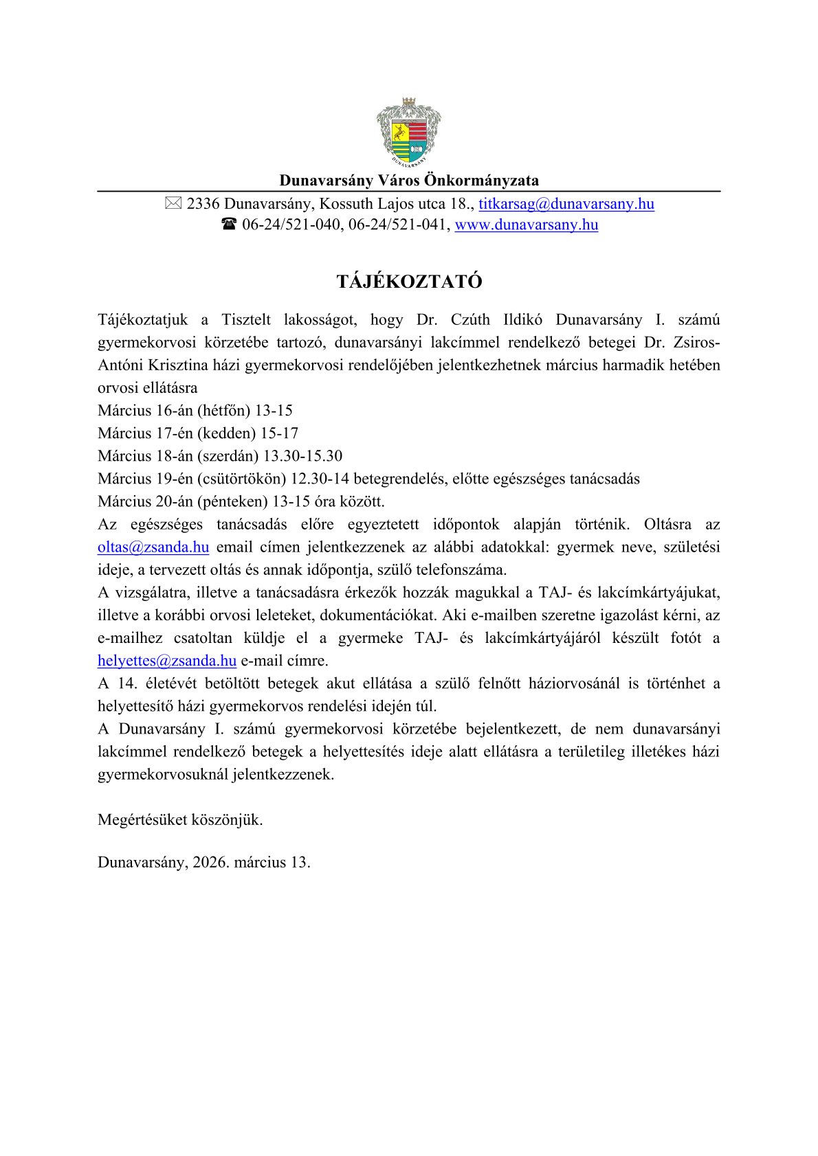 KÖZLEMÉNY – gyermek-háziorvosi helyettesítésről március 16-20.